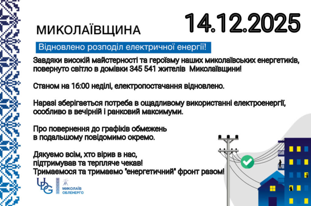 Роботи з відновлення електропостачання після ворожого обстрілу тривають. Наразі одночасно заживити всіх споживачів немає технічної можливості. Розуміємо нагальність потреби, але наполегливо просимо тих, хто буде зі світлом, не перенавантажувати мережу – це може призвести до повторного аварійного відключення.